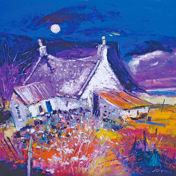 Evening Falls on Archie Baldies, Gribun by John Lowrie Morrison OBE (Jolomo) captures a tranquil Mull evening in vivid colour. Available in multiple sizes with expert framing at First4Frames Gallery.
