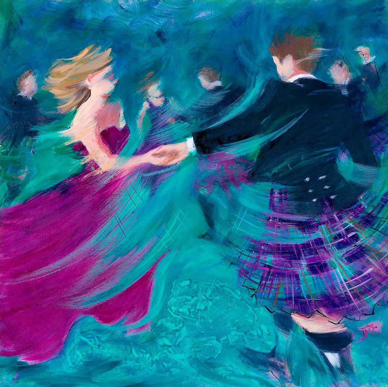 Janet works from photographs, sketches and from life, attending Highland Dancing competitions, Scottish Country Dancing events and Ceilidhs all over Scotland. Her aim is to make the viewer smile and to induce a sense of nostalgia while putting a modern twist on the spectacle of these ancient traditional dances. Janet’s paintings have been used to illustrate the Royal Scottish Country Dancing Society’s Annual Review since 2011.