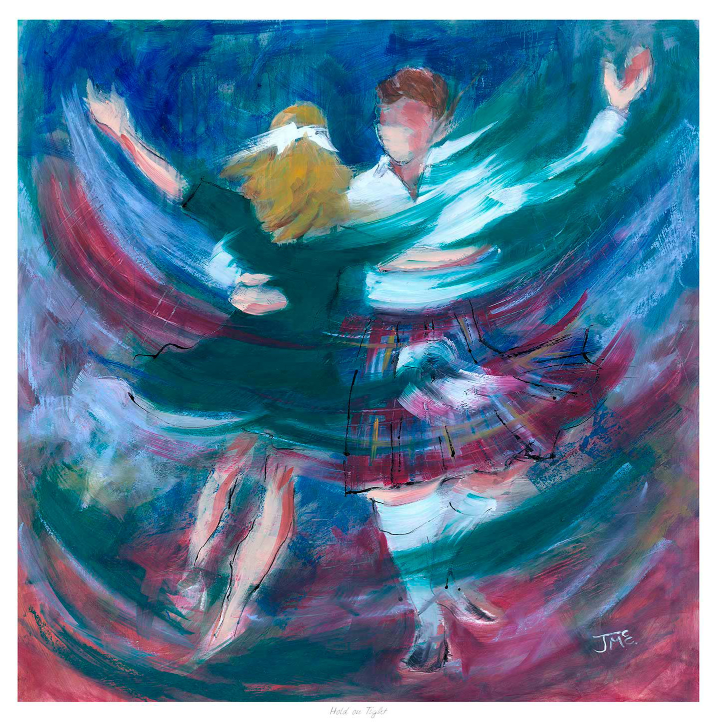 Janet paints Scottish dancers using mixed media, plotting out the familiar shapes by scraping and scratching vibrant colours across the painting meeting the challenge of capturing the look of the tartan and the movement and exuberance of the dance.