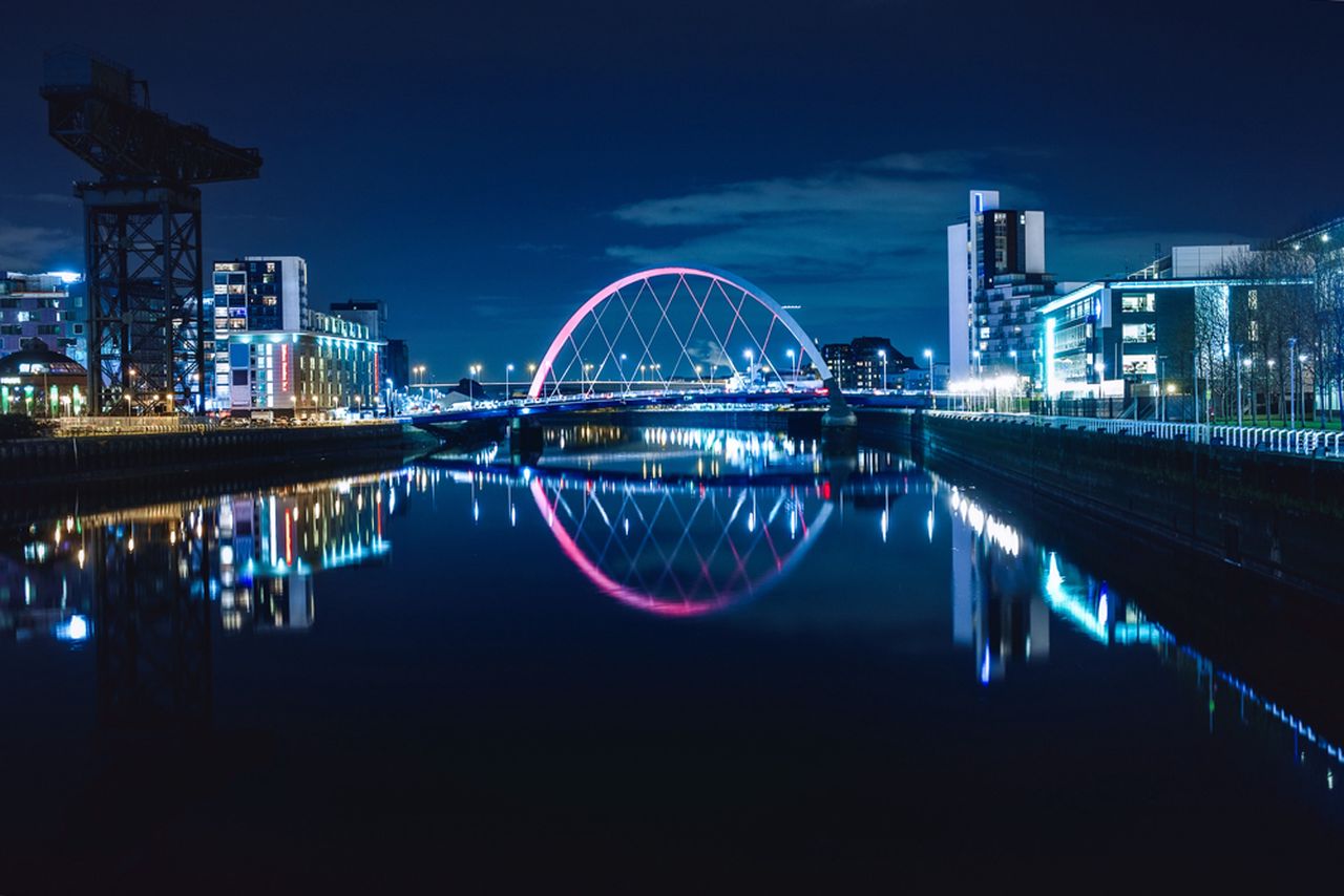 Night view of the Clyde Arc or Squinty Bridge from the East and river Clyde, Glasgow, Scotland