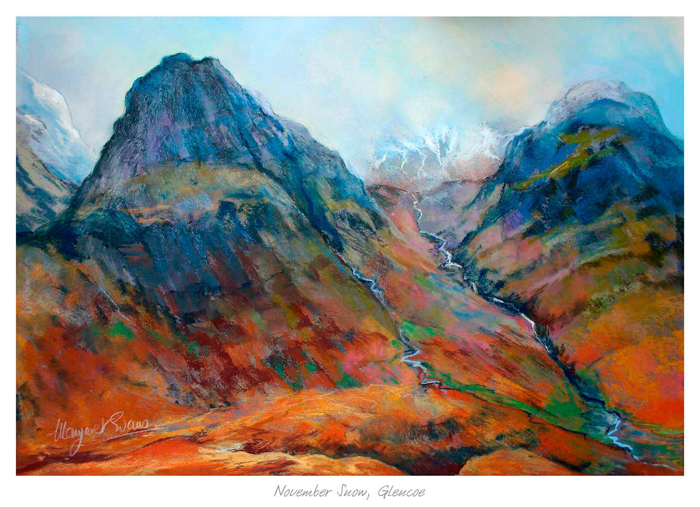 Margaret Evans is a Scottish contemporary artist & an internationally respected tutor & author of numerous teaching art books & DVD’s. She now paints full time in her studio in Highland Perthshire, an area of outstanding beauty in Scotland. Situated approximately 40 miles north of Edinburgh & Glasgow, the area offers plenty of inspirational subject featured in Margaret’s work, such as dramatic skies, seasonal woodland spots, Loch Earn & Grampian Mountains nearby.