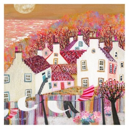 The palette and style speak of Monaghan’s distinctive approach. Known for her love of colour and emotion, Monaghan layers acrylics, inks, oil pastels and charcoal to create a stylised yet affectionate depiction of everyday places. First4Frames Gallery The result is not hyper-realism but a simplified, joyous, expressive scene — one that captures mood and memory rather than photographic detail. In “Sea View And Washing Lines, Pittenweem,” light dances off the sea and the bright whites of the laundry, while warm tones of village buildings contrast with the cool blues of the coastal backdrop — the painted scene evokes nostalgia, tranquillity and coastal charm.